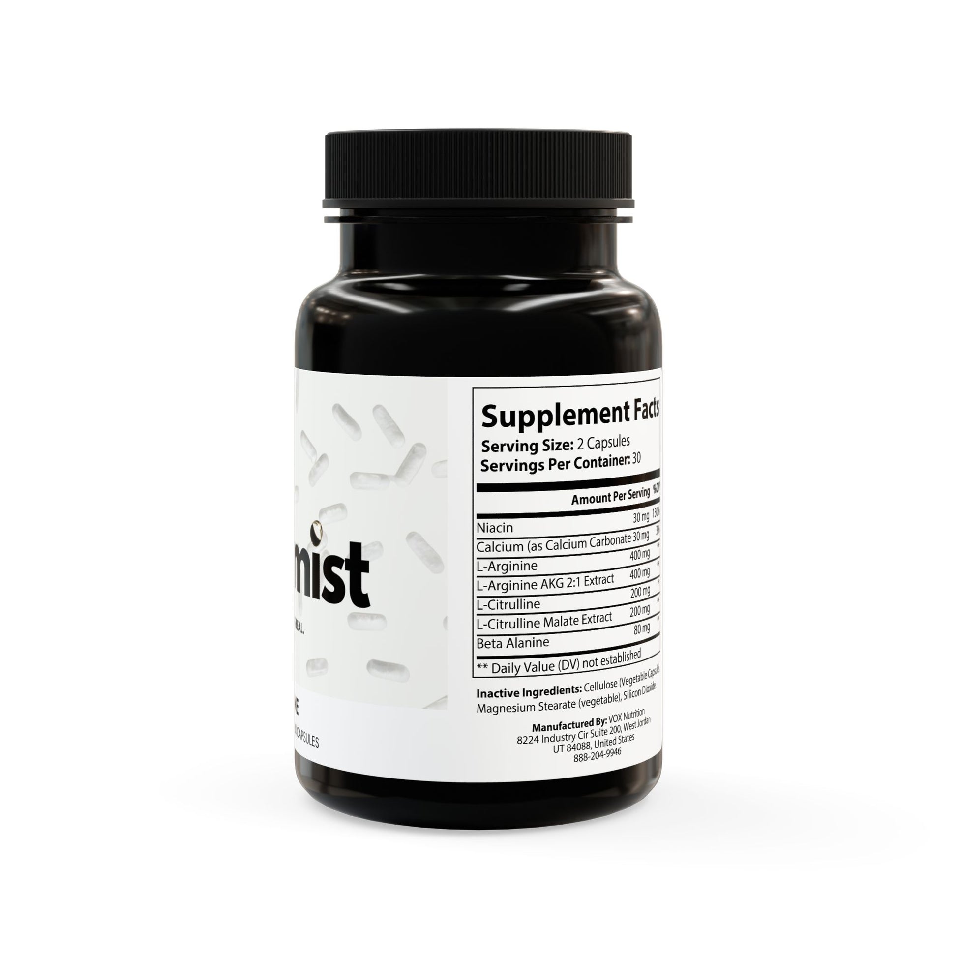 Ingredients: Niacin, Calcium, L-Arginine, L-Arginine AKG 2:1 Extract, L-Citrulline, L-Citrulline Malate Extract, Beta Alanine. Inactive Ingredients: Cellulose (Vegetable Capsule), Magnesium Stearate (vegetable), Silicon Dioxide.