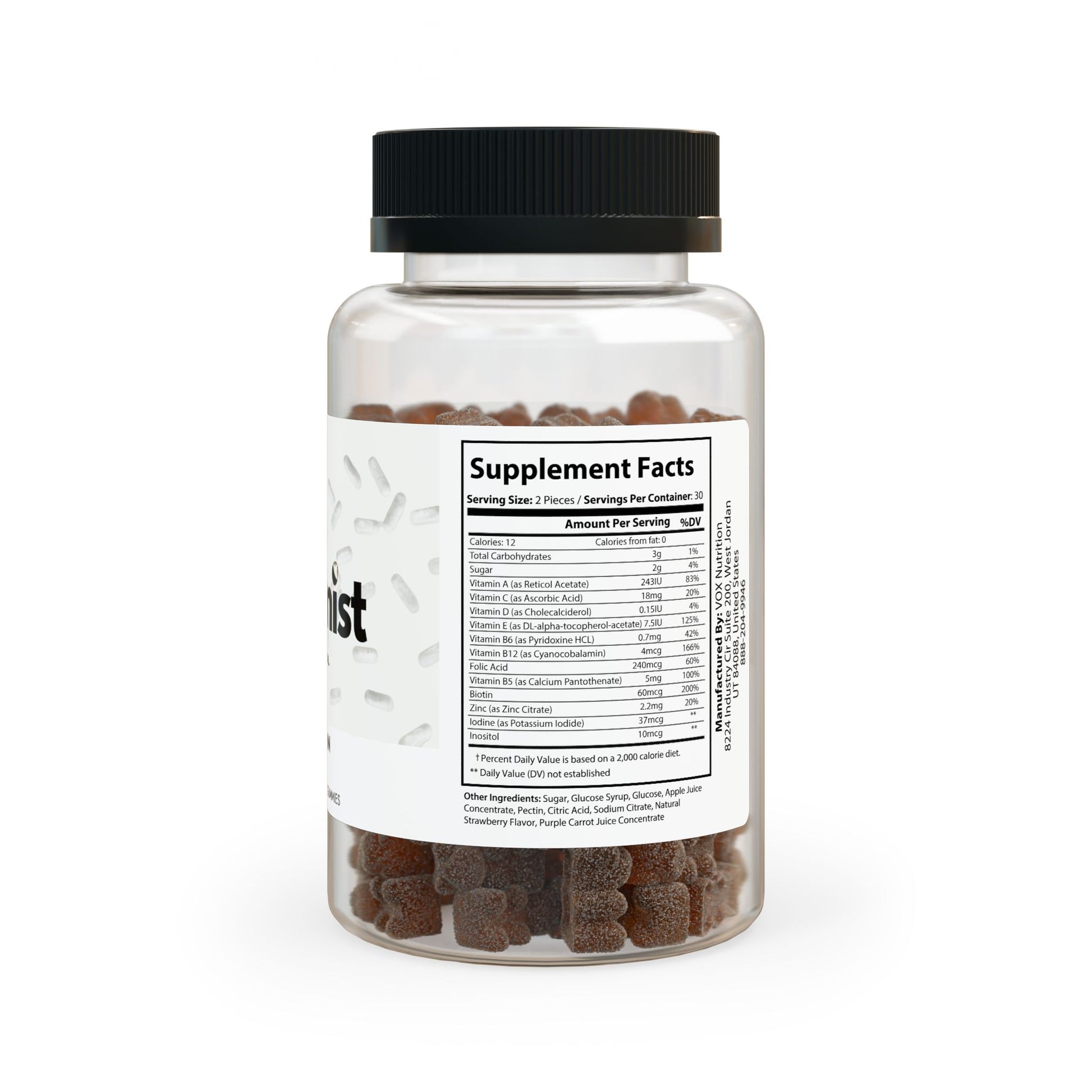 Ingredients: Vitamin A (as Reticol Acetate), Vitamin C (as Ascorbic Acid), Vitamin D (as Cholecalciderol), Vitamin E (as DL-alpha-tocopherol-acetate), Vitamin B6 (as Pyridoxine HCL), Vitamin B12 (as Cyanocobalamin), Folic Acid, Vitamin B5 (as Calcium Pantothenate), Biotin, Zinc (as Zinc Citrate), Iodine (as Potassium Iodide), Inositol. Other Ingredients: Sugar, Glucose Syrup, Glucose, Apple Juice Concentrate, Pectin, Citric Acid, Sodium Citrate, Natural Strawberry Flavor, Purple Carrot Juice Concentrate