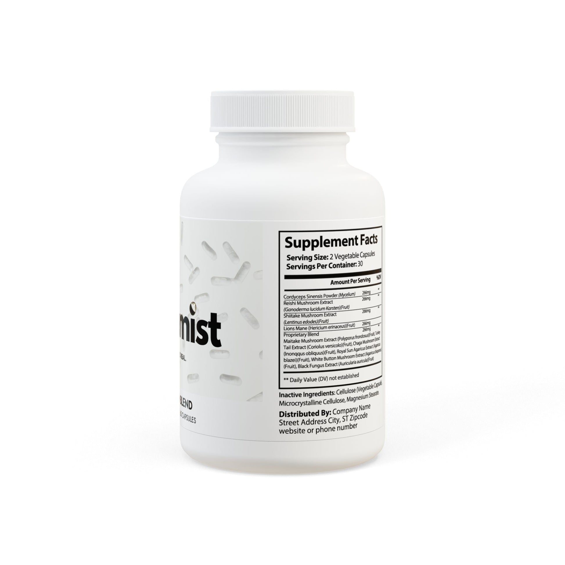 Ingredients: Cordyceps Sinensis Powder (Mycelium), Reishi Mushroom Extract, (Ganoderma lucidum Karsten)(Fruit), Shiitake Mushroom Extract, (Lentinus edodes)(Fruit), Lions Mane (Hericium erinaceus)(Fruit), Proprietary Blend, Maitake Mushroom Extract (Polyporus frondosus)(Fruit), Turkey Tail Extract (Coriolus versicolor)(Fruit), Chaga Mushroom Extract, (Inonqqus obliquus)(Fruit), Royal Sun Agaricus Extract (Agaricus blazei)(Fruit), White Button Mushroom Extract (Agaricus bisporus), (Fruit), Black Fungus Extract (Auricularia auricula)(Fruit), Cellulose (Vegetable Capsule), Microcrystalline Cellulose, Magnesium Stearate.