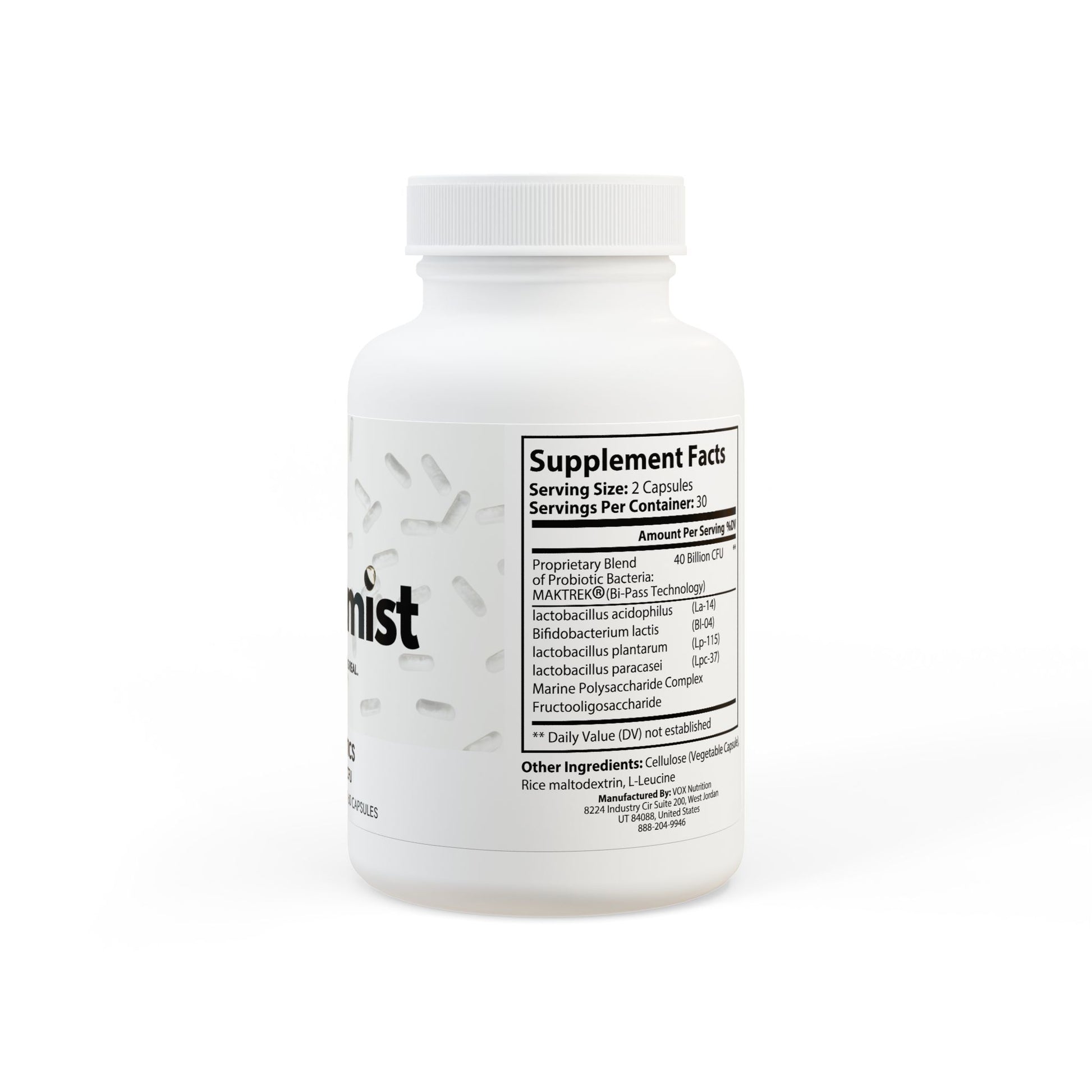 Ingredients: Proprietary Blend 40 Billion CFU of Probiotic Bacteria: MAKTREK (Bi-Pass Technology), lactobacillus acidophilus (La-14), Bidobacterium lactis (Bl-04), lactobacillus plantarum (Lp-115), lactobacillus paracasei (Lpc-37), Marine Polysaccharide Complex, Fructooligosaccharide ®. Other Ingredients: Cellulose (Vegetable Capsule), Rice maltodextrin, L-Leucine