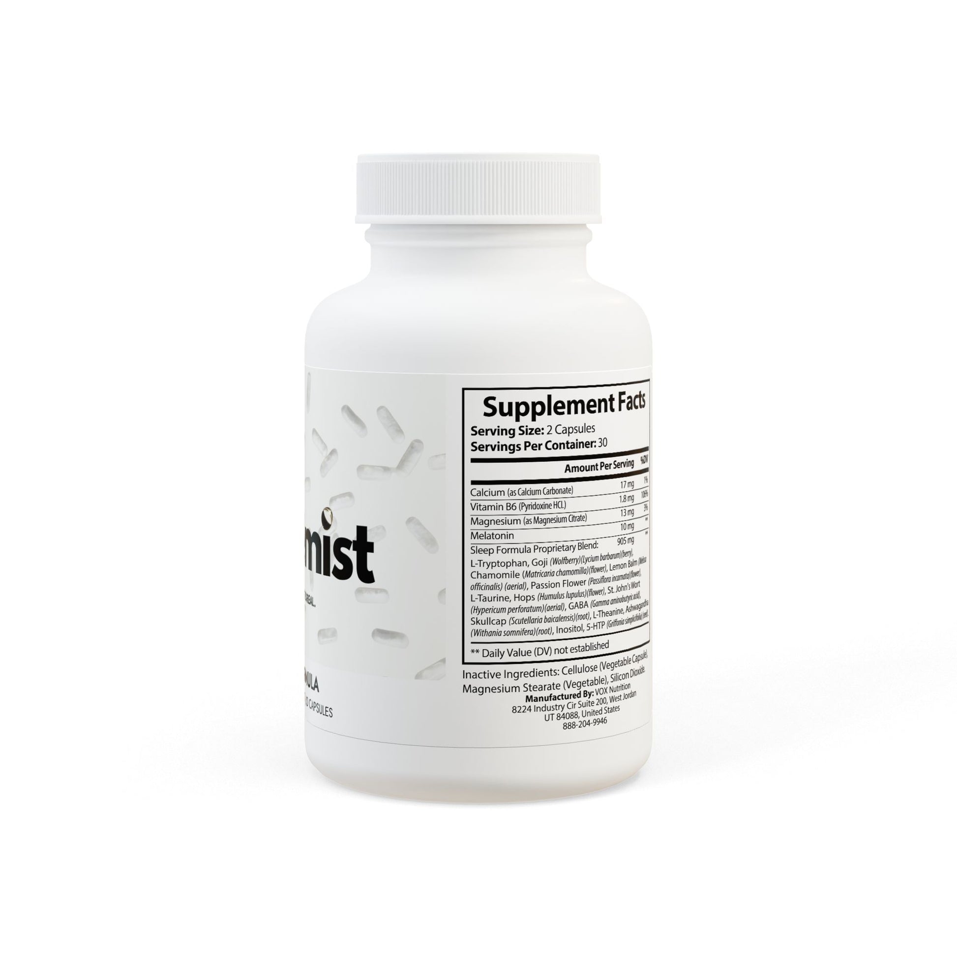 Ingredients: Calcium (as Calcium Carbonate), Vitamin B6 (Pyridoxine HCL), Magnesium (as Magnesium Citrate), Melatonin, Sleep Formula Proprietary Blend: L-Tryptophan, Goji (Wolfberry)(Lycium barbarum)(berry), Chamomile (Matricaria chamomilla)(ower), Lemon Balm (Melissa